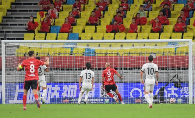 成都蓉城队球员费利佩(右二)在比赛中射门得分 新华社记者 王曦 摄